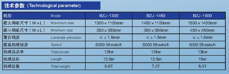 BZJ系列全自動裱紙機(jī)采用后推爪、后定位送紙,配合彈片側(cè)規(guī)和底紙吸風(fēng)系統(tǒng),使得本機(jī)型使用紙張范圍廣、精度高同時(shí)保留了本機(jī)型操作簡單、維護(hù)方便的特點(diǎn)。